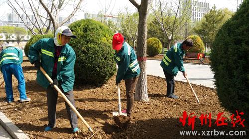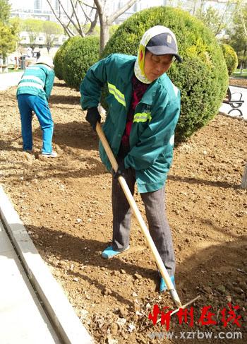 春暖花開,4月13日,忻州市人民公園的園林養(yǎng)護人員忙著翻地、施肥,為不同花期的育苗做準備。忻州市人民公園是我市城市文明的一大場所,為全方位提升人均環(huán)境質量和城市競爭力,給廣大市民創(chuàng)造一個文明、衛(wèi)生、安全、和諧的休閑游樂環(huán)境,園林養(yǎng)護人員一年四季不斷地為公園綠化服務,確保公園內的花、草、樹都能如期開花、結果。(李濤 攝)