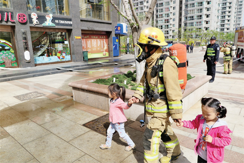 圖為消防員護送小朋友離開救援現(xiàn)場