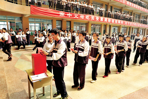 5 月19 日上午,忻州市第一中學(xué)師生利用課間操活動(dòng)時(shí)間,參加忻府區(qū)換屆選舉教育選區(qū)選舉區(qū)人大代表的投票活動(dòng)。圖為學(xué)生們將填寫好的選票投入投票箱。(魯明強(qiáng) 攝)