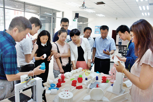 6 月1 日上午,市科技局對我市的兩個眾創(chuàng)空間進(jìn)行掛牌。目前我市已建成7 家眾創(chuàng)空間,搭建了廣闊的平臺,鼓勵大學(xué)生創(chuàng)業(yè)。圖為市科技局和忻府區(qū)科技局的領(lǐng)導(dǎo)以及新聞媒體人員在大學(xué)生創(chuàng)業(yè)園區(qū)的眾創(chuàng)空間參觀3D打印。(楊峻峰 攝)