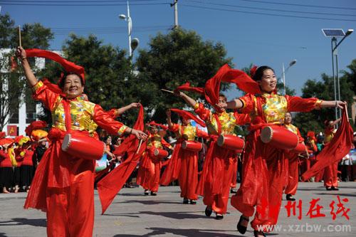 圖為韓家樓鄉(xiāng)健身舞隊正在表演《健身腰鼓》