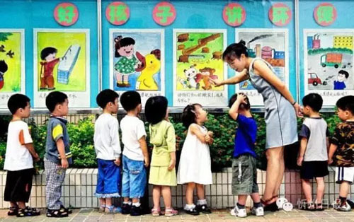 《從小教育》拍于原平市。幼兒園老師在環(huán)保宣傳欄前,教育幼兒園的孩子們從小養(yǎng)成熱愛(ài)環(huán)境衛(wèi)生。(楊紅 攝)