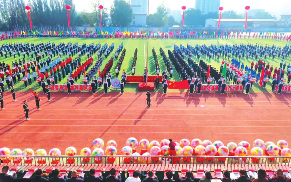 9月28日,原平市范亭中學(xué)校運(yùn)動場上彩旗招展、鼓樂喧天,該市中小學(xué)秋季田徑運(yùn)動會開幕,有小學(xué)、初中、高中的38支代表隊共3000余人參加了開幕式。圖為開幕式現(xiàn)場。(吉建平攝)