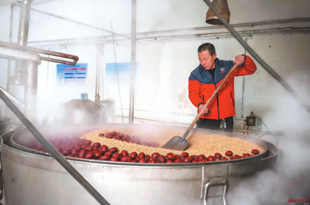 近年來,保德縣貢棗酒開發(fā)基地以“保德油棗”與枸杞入酒,不僅更好地保留了果實(shí)的溫補(bǔ)特性,也釀出了獨(dú)特的地方風(fēng)味。該基地不僅是當(dāng)?shù)赝苿?dòng)紅棗產(chǎn)業(yè)深加工、提升附加值的關(guān)鍵項(xiàng)目,也是將地理標(biāo)志農(nóng)產(chǎn)品轉(zhuǎn)化為特色商品、助力鄉(xiāng)村振興的生動(dòng)實(shí)踐。圖為保德縣貢棗酒基地,工人在蒸餾車間翻動(dòng)攪拌麥殼與紅棗等原料,車間內(nèi)蒸汽彌漫。(記者 范琛攝)