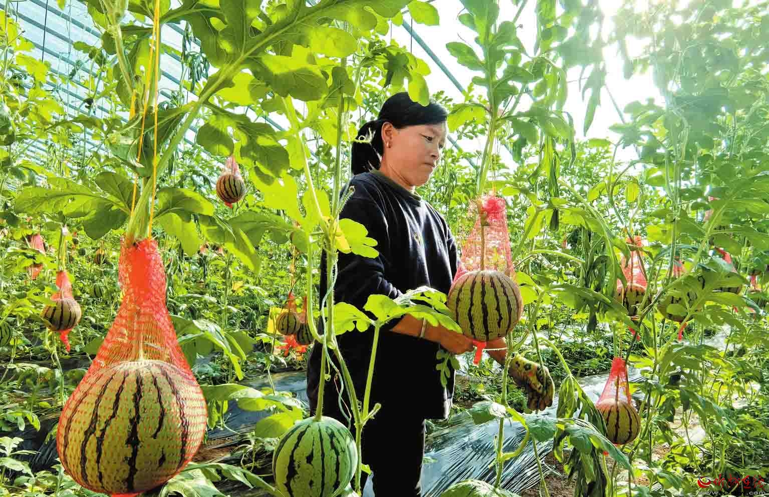 寧武縣充分發(fā)揮地域優(yōu)勢(shì),把設(shè)施蔬菜產(chǎn)業(yè)作為鞏固拓展脫貧攻堅(jiān)成果同鄉(xiāng)村振興有效銜接的有力抓手,積極扶持、鼓勵(lì)農(nóng)民大力發(fā)展周期短、產(chǎn)量高、單價(jià)高的設(shè)施蔬菜產(chǎn)業(yè),帶動(dòng)群眾增收致富。圖為鳳凰鎮(zhèn)周家堡村農(nóng)民在大棚采摘西瓜。(記者劉紀(jì)森攝