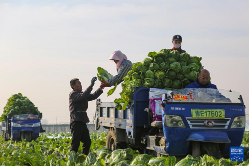 12月18日,農(nóng)民在山東省東營市廣饒縣李鵲鎮(zhèn)將收獲的白菜裝車。(新華社發(fā) 劉云杰 攝)