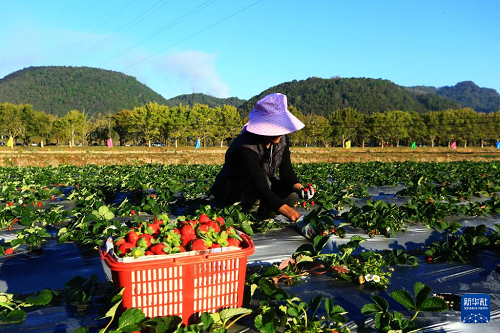 12月18日,云南省騰沖市和順鎮(zhèn)農(nóng)戶在采摘草莓。(新華社發(fā) 趙輝 攝)