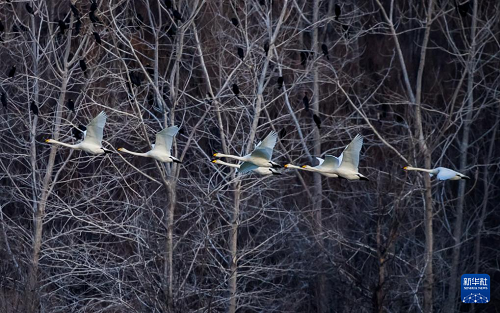 這是12月20日在河南省三門峽市黃河濕地拍攝的白天鵝。(新華社發(fā) 李恒 攝)