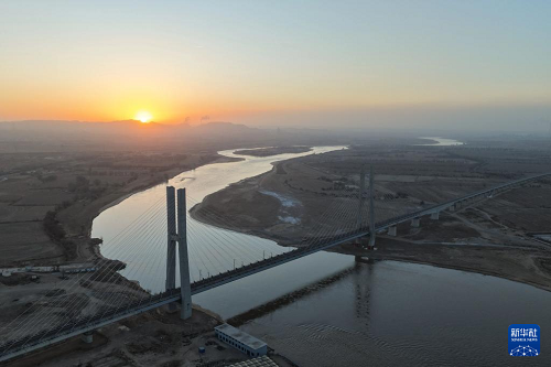12月23日在日出時分拍攝的包銀高鐵烏海黃河特大橋。(新華社記者 邢廣利 攝)