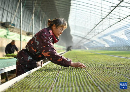 12月29日,肅寧縣領(lǐng)頭雁蔬菜苗繁育專業(yè)合作社的社員在大棚內(nèi)管理蔬菜苗。(新華社記者 楊世堯 攝)