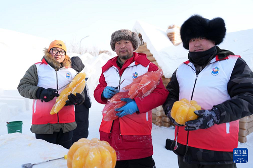 1月28日,第二十七屆哈爾濱冰雪大世界的冰雕師使用植物彩色冰進(jìn)行雕刻創(chuàng)作,為冰雕藝術(shù)帶來嶄新的視覺體驗(yàn)。
