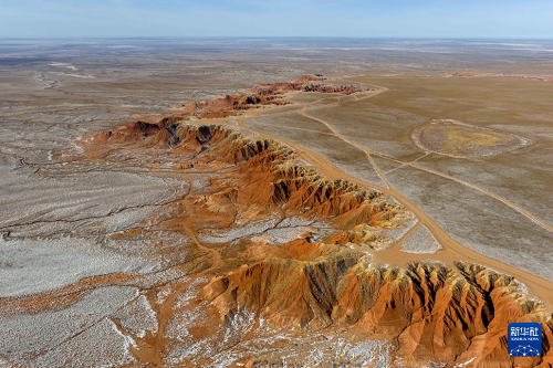 這是1月29日在內(nèi)蒙古烏蘭察布市四子王旗拍攝的紅崖臺(tái)地景觀(無人機(jī)照片)。(新華社記者 貝赫 攝)