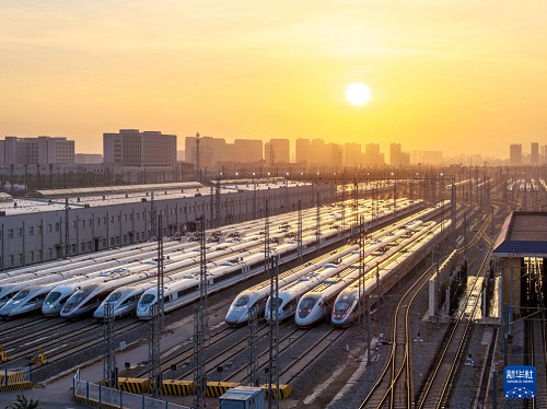 2月1日,國鐵西安局西安動車段動車庫內(nèi)高鐵動車組整齊列陣(無人機(jī)照片)。(新華社發(fā) 張文 攝)
