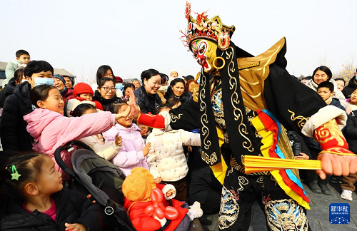 2月10日,在河南省周口市川匯區(qū)關帝廟廣場,進行表演的民間藝人與觀眾互動。(新華社發(fā) 高建中 攝)