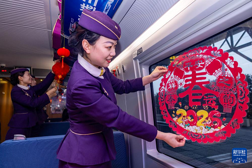 2月11日,南京客運段G2584次列車乘務員在餐車內(nèi)貼窗花。(新華社發(fā) 湯德宏 攝)