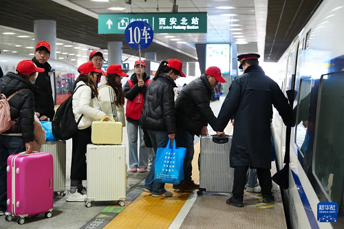 2月24日,來(lái)自西安市周至縣的務(wù)工人員在西安北站登上G1922次列車(chē)。(新華社記者 邵瑞 攝)