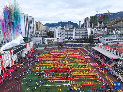 這是2月27日拍攝的貴州省石阡縣仡佬毛龍節(jié)開幕式現(xiàn)場(chǎng)(無人機(jī)照片)。(新華社記者 楊文斌 攝)
