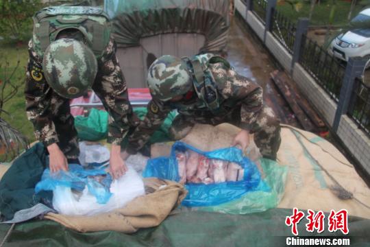 圖為邊防官兵在可疑貨車內(nèi)發(fā)現(xiàn)大量走私凍品。 楊添 攝