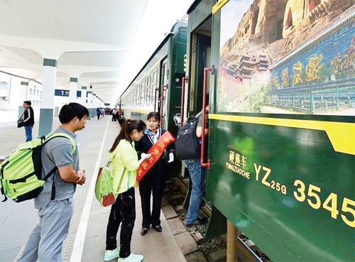 5月27日,旅客在大同火車站檢票登上Y665次列車。當(dāng)日,山西省首趟“Y”(游)字頭城際旅游專列Y665次列車從大同火車站駛出,開往太原,兩座城市間的旅行時(shí)間縮短至3小時(shí)以內(nèi)。這輛被命名為“云岡號(hào)”的一站直達(dá)列車由6節(jié)硬座車、1節(jié)硬臥車、1節(jié)軟臥車組成,每逢周五、六、日發(fā)車,運(yùn)行時(shí)長較目前兩地開行的最快列車還要節(jié)省近50分鐘。(來源:黃河新聞網(wǎng))