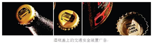 美國(guó)將警示語(yǔ)作為酒品包裝的強(qiáng)制性標(biāo)注內(nèi)容,要求飲料,酒的品牌標(biāo)簽、獨(dú)立的前標(biāo)簽或者背標(biāo)簽、側(cè)標(biāo)簽都應(yīng)獨(dú)立,并有別于標(biāo)簽中其他信息地標(biāo)示:“政府警示,根據(jù)普通外科醫(yī)生建議,孕婦不應(yīng)該飲酒,以防止新生兒缺陷,飲酒會(huì)減弱個(gè)人駕駛車或操控機(jī)械的能力并可能引發(fā)健康問題?!贝送?國(guó)外的產(chǎn)品包裝設(shè)計(jì)上也植入了公益理念。如上圖廣告可對(duì)飲酒人群針對(duì)性的進(jìn)行廣告宣傳,采用打開酒瓶蓋必須以破壞“車輛”為代價(jià)的形式,傳達(dá)喝酒不能開車的安全理念。