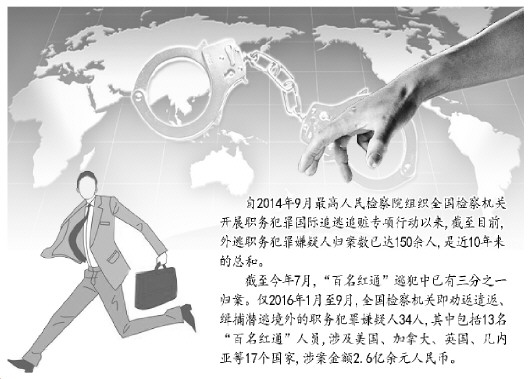 據(jù)了解,截至今年7月,“百名紅通”逃犯中已有三分之一歸案。僅2016年1月至9月,全國檢察機關即勸返遣返、緝捕潛逃境外的職務犯罪嫌疑人34人,其中包括裴健強、陳祎娟、付耀波、周世勤等13名“百名紅通”人員,涉及美國、加拿大、英國、幾內亞等17個國家,涉案金額2.6億余元人民幣。