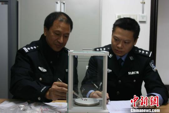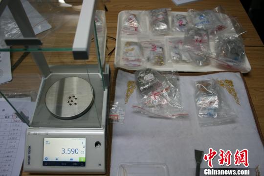 海關緝私警察正在給查獲的寶石稱重 關悅 攝