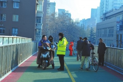 昨天上午9點多,在雙井橋北一處橫跨三環(huán)路的過街天橋上,幾名送餐員騎著電動車通過過街天橋?,F(xiàn)場的交警將騎行的電動車攔停,并向騎車人解釋,在過街天橋上騎行電動車的危險性及違法性,應(yīng)該接受處罰。據(jù)了解,按照《北京市實施〈道交法〉辦法》第85條第五項的規(guī)定,在過街天橋上騎行電動車橫穿天橋?qū)儆谶`法行為,需要當(dāng)場繳納20元罰款。
