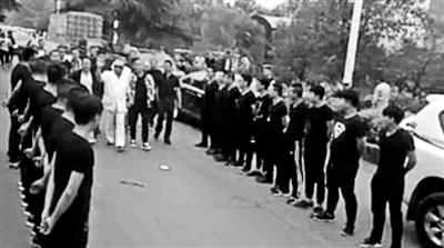 在監(jiān)獄管教樓前,蒙某錄等人指揮20余名黑衣人,在道路列隊彩排,并將14盤1萬響鞭炮及8個100響禮花炮擺放在監(jiān)獄門口附近及沿途道路上。上午10點,蒙某錄、程某林各持一束鮮花,帶領(lǐng)20余名黑衣人進入晉城監(jiān)獄管教大樓內(nèi),列隊迎接程幼澤出獄。