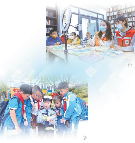 圖①:江蘇省如皋市如城街道聯(lián)合愛行動實踐中心,走進當(dāng)?shù)仡櫱f社區(qū)農(nóng)家書屋,通過“線上+線下”方式開展“愛閱護苗”主題公益課堂活動。圖為志愿者通過網(wǎng)絡(luò)平臺為學(xué)生推薦好書。