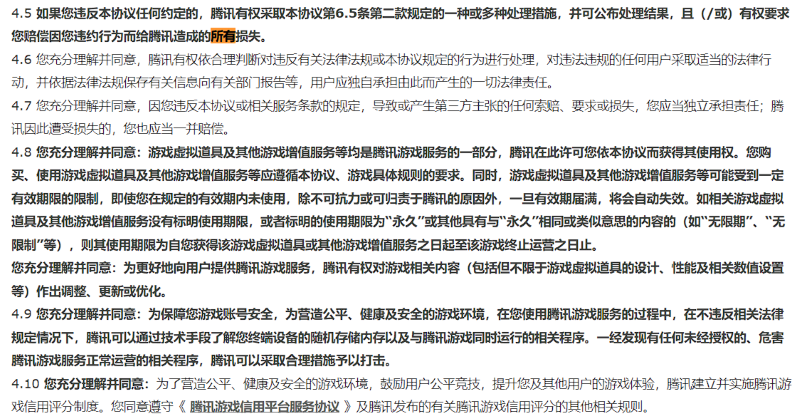 所有網(wǎng)游初次進(jìn)入游戲都會(huì)看到一份密密麻麻的游戲服務(wù)協(xié)議,用戶不同意則不能享受游戲內(nèi)容,包括騰訊在內(nèi)運(yùn)營(yíng)商為什么都這么做?因?yàn)閲?guó)家規(guī)定。根據(jù)《網(wǎng)絡(luò)安全法》《互聯(lián)網(wǎng)信息服務(wù)管理辦法》《互聯(lián)網(wǎng)用戶賬號(hào)信息管理規(guī)定》,互聯(lián)網(wǎng)信息服務(wù)提供者應(yīng)當(dāng)依照法律法規(guī)有關(guān)規(guī)定,制定和公開(kāi)互聯(lián)網(wǎng)用戶賬號(hào)管理規(guī)則、平臺(tái)公約,與用戶簽訂服務(wù)協(xié)議,明確賬號(hào)信息注冊(cè)、使用和管理相關(guān)權(quán)利義務(wù)。玩家使用賬號(hào)如果違反法律法規(guī)、用戶協(xié)議的,互聯(lián)網(wǎng)信息服務(wù)提供者有權(quán)采取警示提醒、限期改正、限制賬號(hào)功能、暫停使用、關(guān)閉賬號(hào)、禁止重新注冊(cè)等處置措施。