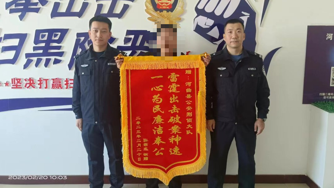 “雷霆出擊破案神速,一心為民廉潔奉公。”2023年2月20日,張先生親自將一面錦旗送到河曲縣公安局民警手中,感激之情溢于言表。
