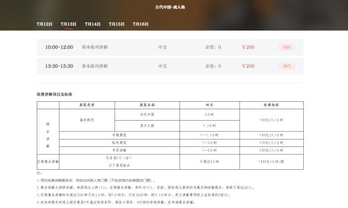 古代中國展收費講解項目及標準 截圖自國家博物館官網(wǎng)