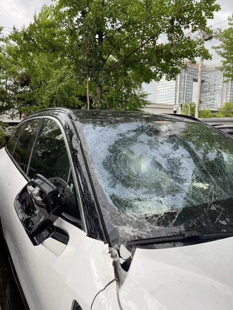 北京市民張先生的車輛在一次較強雷雨天氣中遭樹木砸毀(5月30日攝)。新華社發(fā)