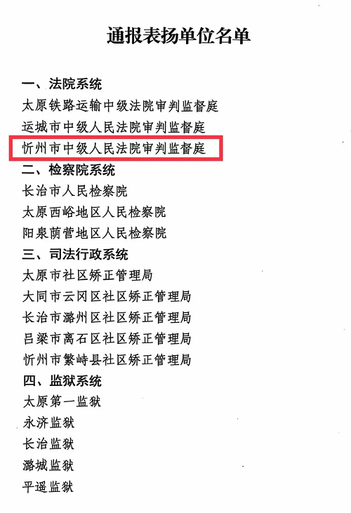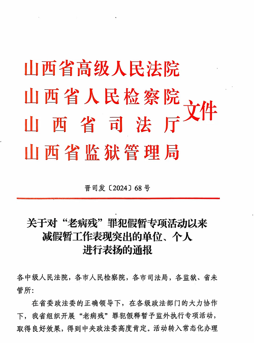 近日,山西省高級人民法院、山西省人民檢察院、山西省司法廳、山西省監(jiān)獄管理局印發(fā)《關(guān)于對“老病殘”罪犯假暫專項活動以來減假暫工作表現(xiàn)突出的單位、個人進(jìn)行表揚(yáng)的通報》,對減假暫工作表現(xiàn)突出的16家單位和25名個人予以通報表揚(yáng),忻州中院審判監(jiān)督庭獲評“全省減假暫工作表現(xiàn)突出單位”。