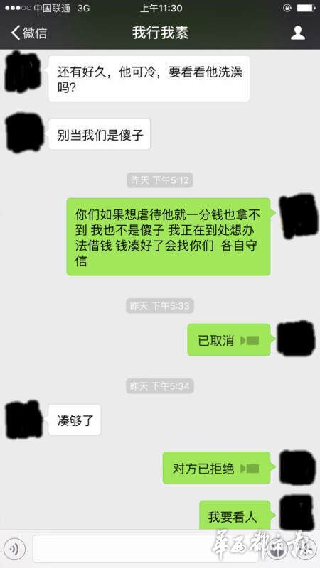 趙婷用微信與丈夫聯(lián)系,回復(fù)的人卻變成了“綁匪”,索要6萬元的贖金,否則撕票。趙婷說,一定會湊錢,但要保證王江的人生安全,不能虐待,各取所需都不為難人,“綁匪”卻一直逼問著錢的下落,并煞有其事地強調(diào)“不要報警”。