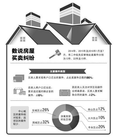 雖然房子賣了,但是賣家卻遲遲不遷走戶口;買了學(xué)區(qū)房因無(wú)法落戶導(dǎo)致孩子上學(xué)成了泡影……昨天,市二中院召開(kāi)房屋買賣合同糾紛案件發(fā)布會(huì),調(diào)研顯示,買房人要求現(xiàn)有戶口遷出案件占房屋買賣合同糾紛總數(shù)的86%,因戶口遷移引發(fā)的此類案件近年呈增長(zhǎng)趨勢(shì)。市二中院表示,根據(jù)現(xiàn)行法律和政策,警方和法院都無(wú)法強(qiáng)迫原房主遷移戶口。