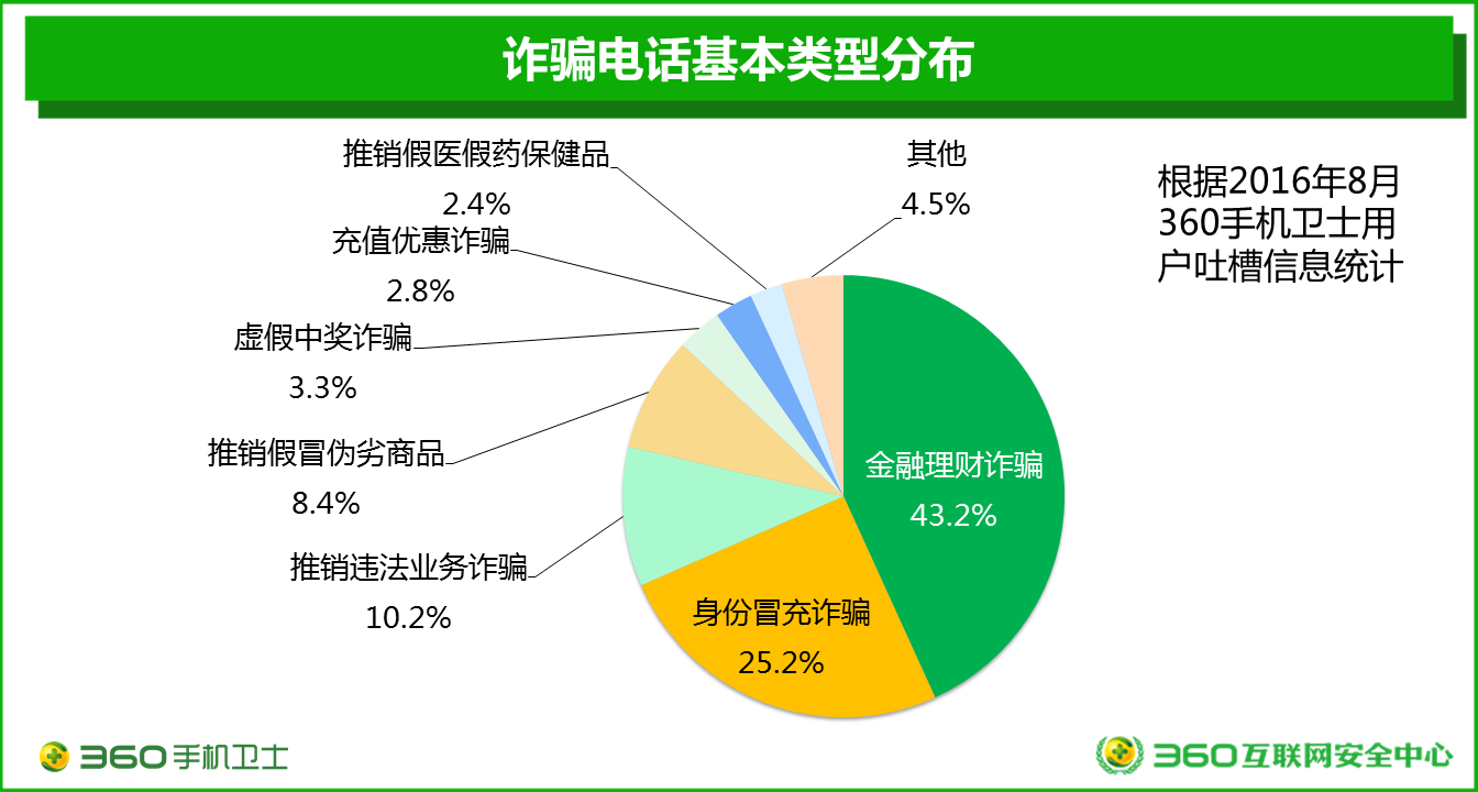 9月7日,360在京發(fā)布了國內(nèi)首份基于大數(shù)據(jù)研究的電信詐騙分析報告——《2016中國電信詐騙形勢分析報告》。報告中顯示,在用戶接到的所有詐騙電話中,虛假的金融理財詐騙最多,占43.2%,此類詐騙在北上廣深等大城市尤其盛行。其次是身份冒充詐騙,占25.2%。各類虛假的業(yè)務推銷電話也是被用戶大量吐槽的詐騙電話類型。