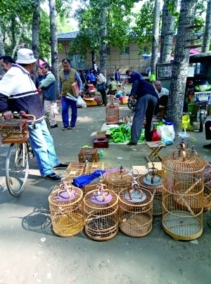 昨天上午,記者來到北沙灘橋附近,看到臨時(shí)集市藏身于一片楊樹林里,并被高高的圍墻圍了起來。樹林里賣鴿子的、賣小鳥的、賣魚的、賣蟲的、賣古玩的攤子應(yīng)有盡有。其中,售賣小鳥的攤子有五六個(gè),有的把鳥籠直接掛在樹上,有的則在地上鋪開來,幾十只鳥籠排成一排(如圖)。據(jù)了解,有護(hù)鳥志愿者在上周末拍到的圖片中,幾百只鳥兒被關(guān)在籠里售賣。