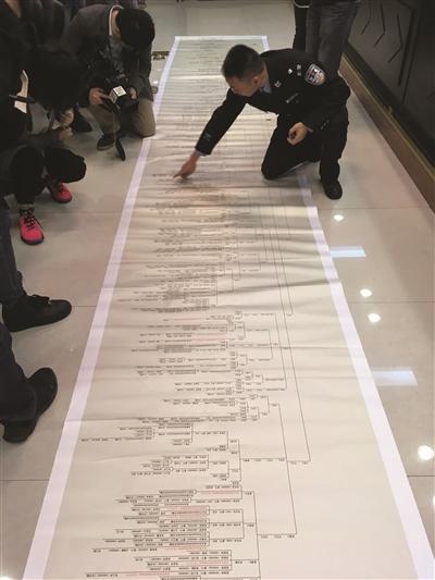 當時公安信息化不是很發(fā)達,家譜上的姓名和公安機關戶籍系統中的姓名有出入。民警將上千名家譜中的男性逐一翻拍,回南京后再根據翻拍的家譜照片,按照每一個人的血緣、親緣、家庭關系,逐人核對、逐人梳理。由于當地家族成員關系非常復雜,民警足足耗時兩個多月,制作出了一份長達6.8米的家譜關系圖。