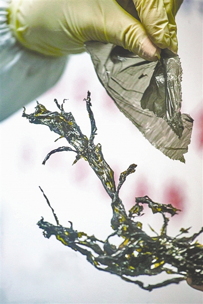 福建省水產(chǎn)加工流通協(xié)會(huì)的報(bào)告稱,受謠言的影響,該省紫菜產(chǎn)業(yè)保守估計(jì)損失將達(dá)到數(shù)千萬元甚至上億元。為澄清傳聞,北京、福建、廣東等地近日對(duì)市場(chǎng)上的紫菜進(jìn)行了檢查或?qū)嶒?yàn)室鑒定。圖為廣州CEC食品安全檢測(cè)中心,對(duì)比干的紫菜和薄塑料袋。
