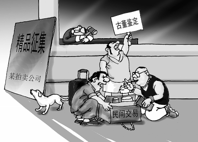 中小拍賣行大批停業(yè),大拍賣行又看不上他們的藏品,普通民間收藏者只好在馬路邊交易。漫畫(huà) 王鵬