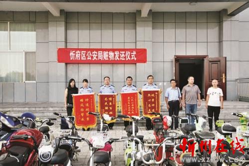 近日,忻府區(qū)公安局舉行贓物發(fā)還儀式,就近期偵破案過程中收繳的部分贓物,包括電動摩托車21輛、電動三輪車1輛,向失主進(jìn)行了集中返還,受到群眾的交口稱贊。魯明強(qiáng) 劉 潔 攝