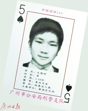 廣州警方昨日通報,近日,黃埔警方偵破一宗16年前的命案積案,抓獲犯罪嫌疑人王圍祥(男,40歲,重慶市人)。此人正是廣州警方撲克牌通緝令中的“黑桃5”。
