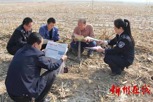怎樣把《中華人民共和國大氣污染防治法》和《五臺縣人民政府嚴(yán)防森林火災(zāi)的通告》宣傳到人?五臺縣環(huán)境保護(hù)局、環(huán)境監(jiān)察大隊分組劃片,組織環(huán)保人員深入到田間地頭,面對面讀報給農(nóng)民聽,手遞手散傳單讓農(nóng)民看,為農(nóng)民解釋燒秸稈、燒地堰、燒荒等野外違規(guī)用火行為的危害。臺城鎮(zhèn)西關(guān)村66歲的農(nóng)民張存在就高興地對縣環(huán)境監(jiān)察人員說:“你們這樣解釋,咱懂,“地頭環(huán)?!痹坜r(nóng)民也記得牢,我家4畝地的秸稈保證不燒一根,咱漚糞去,多打糧,又不污染?!眻D為地頭宣傳環(huán)境保護(hù),增強農(nóng)民環(huán)保意識。(金俊賢 攝)