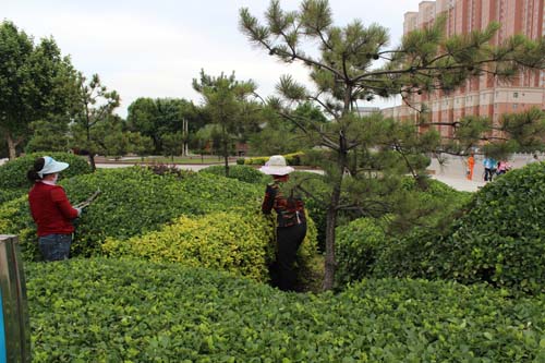 5月24日,幾位來自原平市城郊的留守婦女正在市區(qū)平安大街與京原北路交匯處修剪綠化帶。自原平市開展園林城市建設(shè)以來,為留守婦女提供了打工機(jī)會,使她們在家門口找到活干,既增加了收入,又美化了城市,一舉兩得。(曹申義 攝)