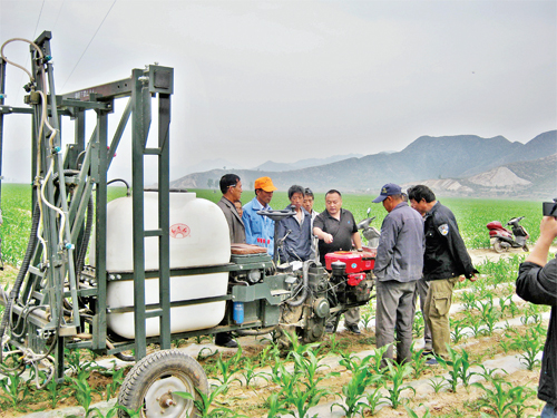 在五臺縣茹村鄉(xiāng)農(nóng)機(jī)化示范區(qū),廠方技術(shù)員正在對農(nóng)機(jī)具操作手進(jìn)行技術(shù)培訓(xùn),該示范區(qū)推廣應(yīng)用了中農(nóng)(北京)豐茂植保機(jī)械有限公司生產(chǎn)的3WX—400G 型自走式高稈作物噴稈噴霧植保機(jī)械,提升了玉米生產(chǎn)機(jī)械化程度。(鄭素平 攝)