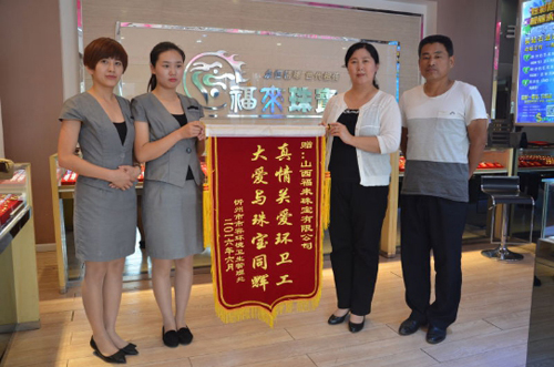 環(huán)衛(wèi)處副處長(zhǎng)張林霞代表環(huán)衛(wèi)處向福來(lái)珠寶回贈(zèng)錦旗以示感謝