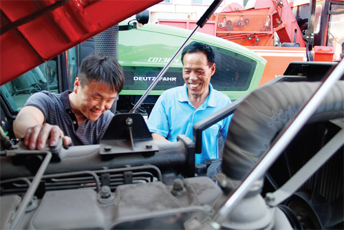 7 月13 日,兩位農(nóng)民在原平市農(nóng)機(jī)公司選購?fù)侠瓩C(jī)。近年來,原平市落實(shí)各項(xiàng)惠農(nóng)政策,極大地調(diào)動了農(nóng)民購買和使用農(nóng)機(jī)具的積極性,在小麥?zhǔn)崭罱咏猜曋H,農(nóng)民抓緊時(shí)間選購?fù)侠瓩C(jī)等國家補(bǔ)貼農(nóng)機(jī)具,為在麥田地里進(jìn)行夏播做準(zhǔn)備。(褚震 攝)