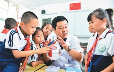 近日,在貴州省黔東南苗族侗族自治州從江縣城關(guān)第三小學(xué),眼科醫(yī)生給學(xué)生講解健康用眼知識(shí)。(石宏輝 攝 人民視覺(jué))