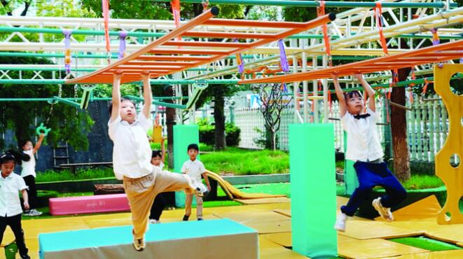 常州市五星幼兒園的負(fù)責(zé)人王艷表示,有一次同事將幾條外國幼兒園、小學(xué)低年級年齡段孩子進(jìn)行體能訓(xùn)練的視頻發(fā)了過來,視頻上的孩子能夠完成跳鞍馬、手倒立行走等動(dòng)作?!坝谑牵覀兘Y(jié)合孩子們的意見,邀請專家共同繪制賽道構(gòu)思圖,將平衡、走、跑、跳、攀爬、懸掛等動(dòng)作元素融為一體,打造出一個(gè)綜合性的體能游戲賽道?!?/p>